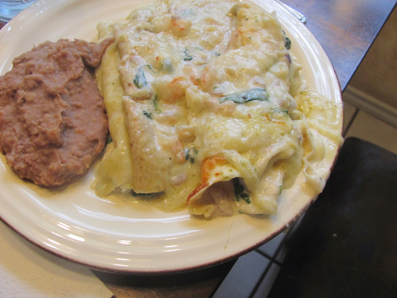Note: When I made it this time, I was only making it for two people. I did not have a poblano pepper or cream of shrimp soup, so this is what I did. I added about 1 tablespoon of butter to the pan. When the butter was melted, I added about 3 tablespoons of onions chopped. After they were soft, I added 1 tablespoons of flour, stirring it until incorporated. Then I added about 1 cup of half and half along with uncooked shrimp. After about 2 minutes, I added two handfuls of fresh spinach. I softened the tortillas in the microwave for 20 seconds. I put about two tablespoons of filling in each of the 5 tortillas and rolled them placing them in the prepared baking dish. Top it with the salsa verde sauce and then the cheese. I did not add the sour cream this time and I only used 1/4 pound of shrimp. It was plenty for the two of us.